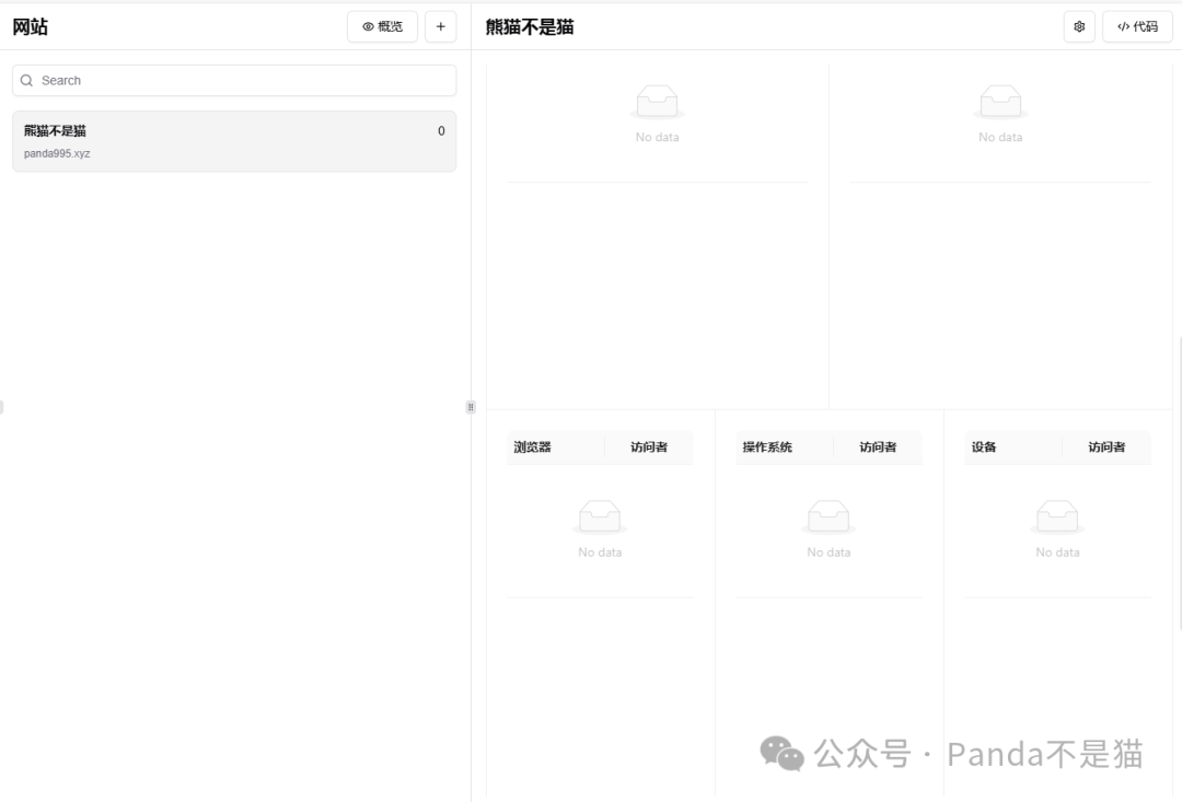 网站监控将监控代码填入到你自己的网站头部信息中就可以了,可同时设置多个网站。熊猫这里因为刚填入,没什么数据就不做过多展示了,无非就是页面、浏览IP、浏览器、以及地区等等信息的查看。