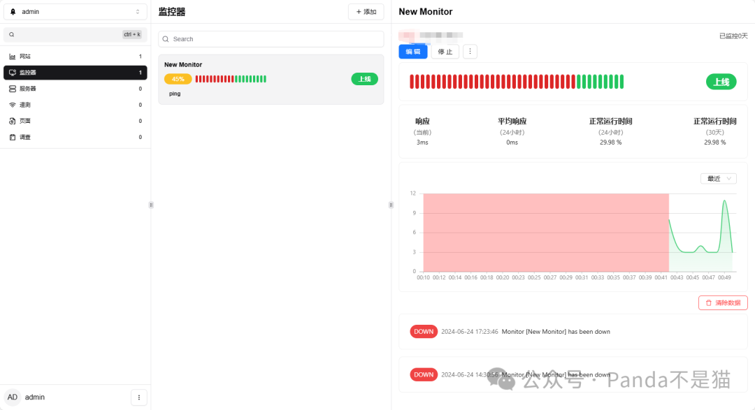 在下面就是监视器,可监控我们的各种主机,例如熊猫这里将其旁路由监控,能清晰看到什么时候上线什么时候下线了。