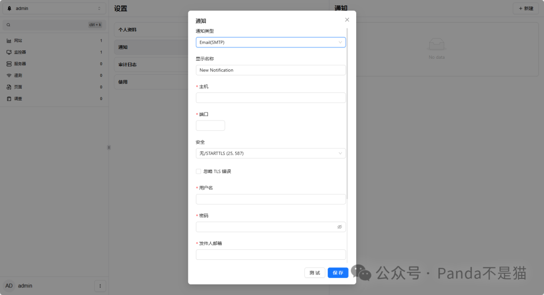 再设置界面可以更改个人账号密码、建立通知以及日志等信息。其中通知信息可通过邮箱、TG、飞书以及webhook进行通知。