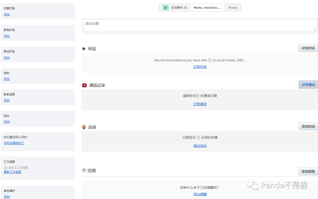 添加后我们点开联系人,便能看到可以选择的项目还是蛮多的,你可以设置你们之间的关系,添加联系方式与住址,甚至还能添加他的宠物信息。同时也可以用来记录你们之间的通讯记录,是否有活动以及有没有金钱礼物往来也能记录。