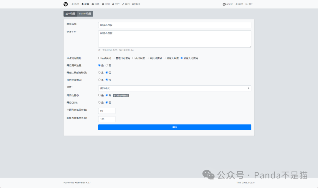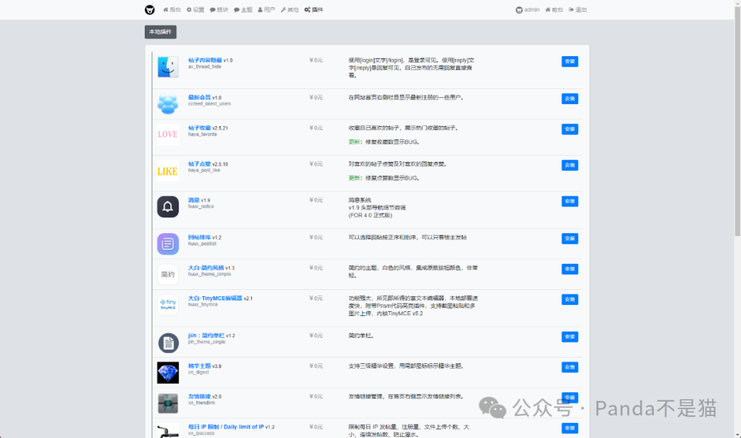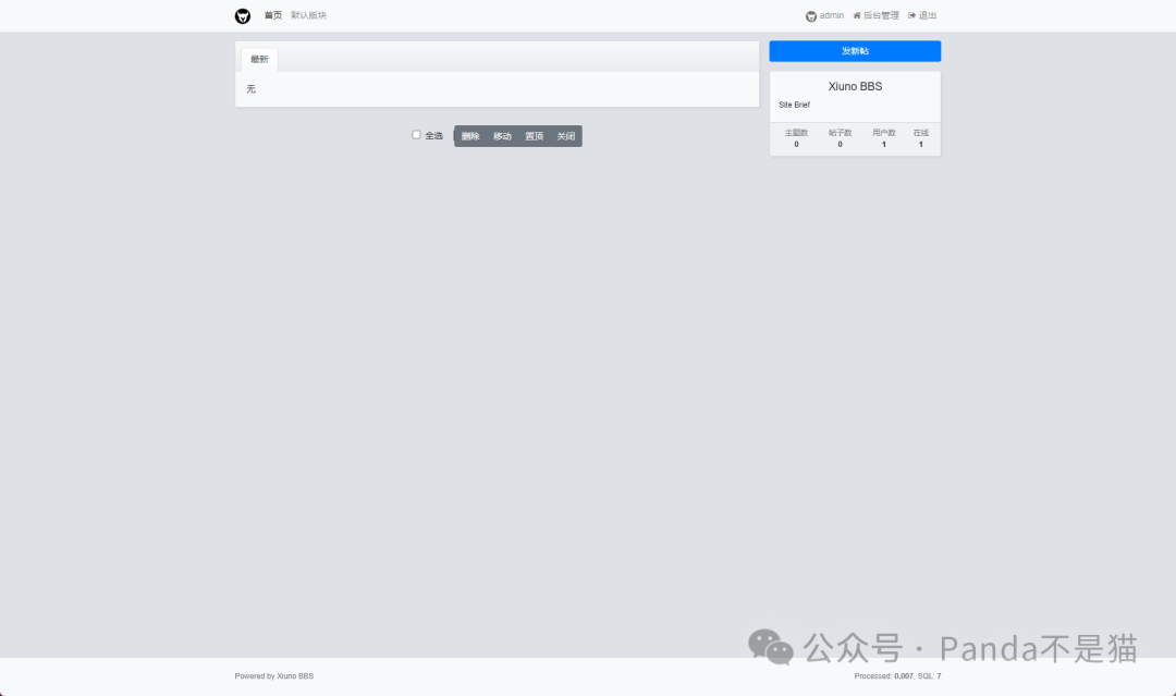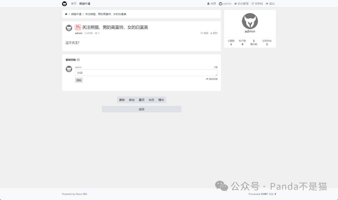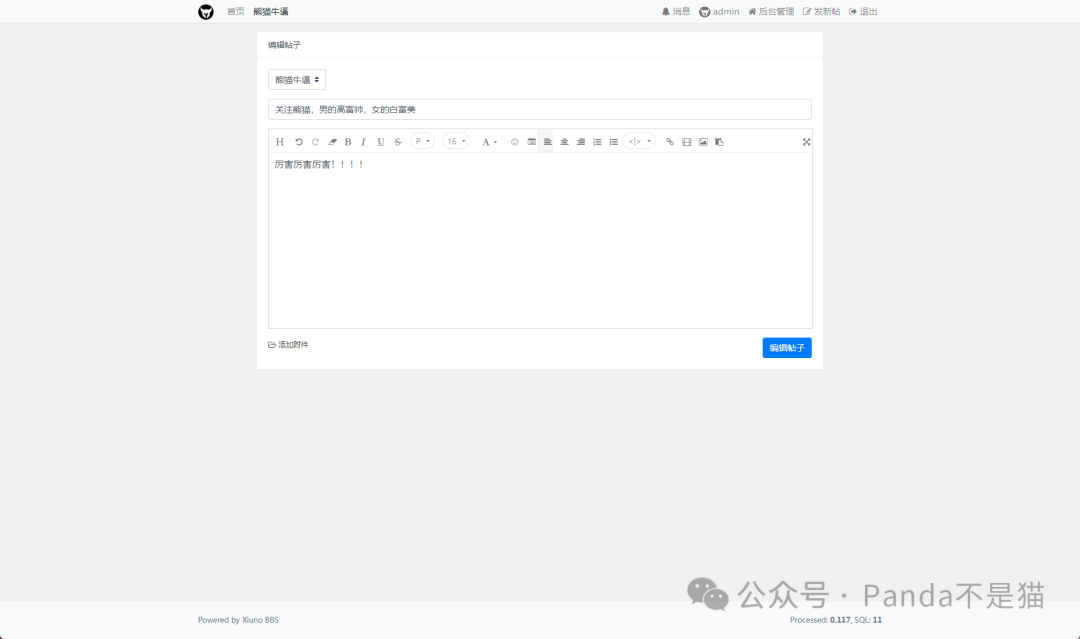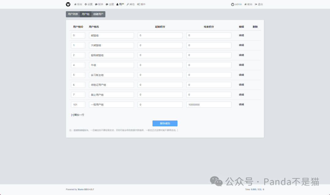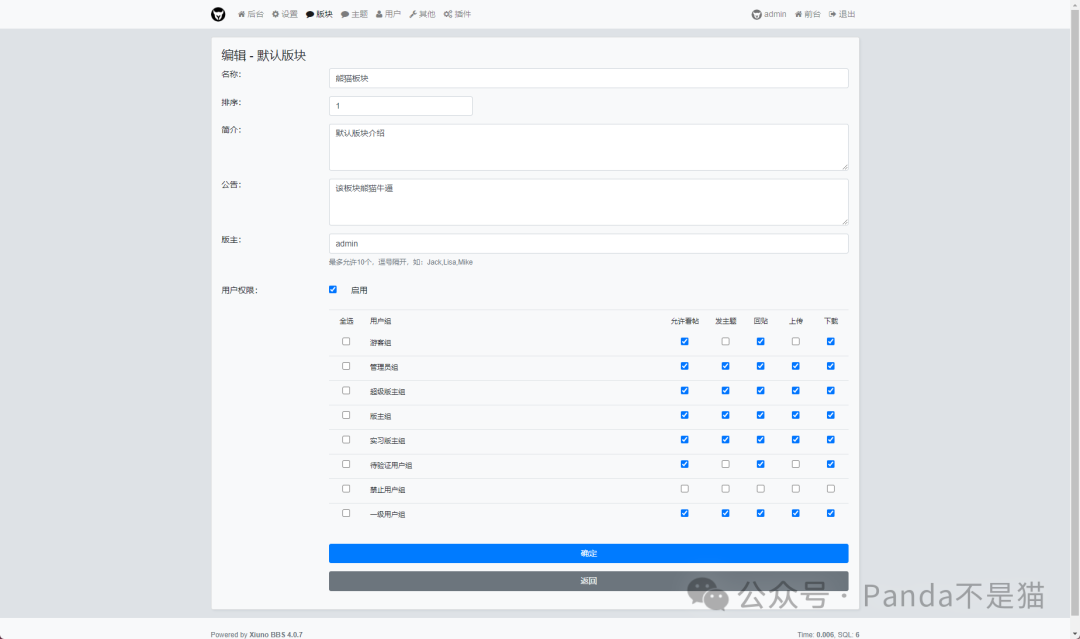经常逛论坛或者和熊猫差不多年龄的,应该对板块这个功能并不陌生。xiunobbs对板块也支持自定义编辑,这里可以修改板块的名称、介绍以及公告,同时支持设置版主与对应用户组的板块权限。