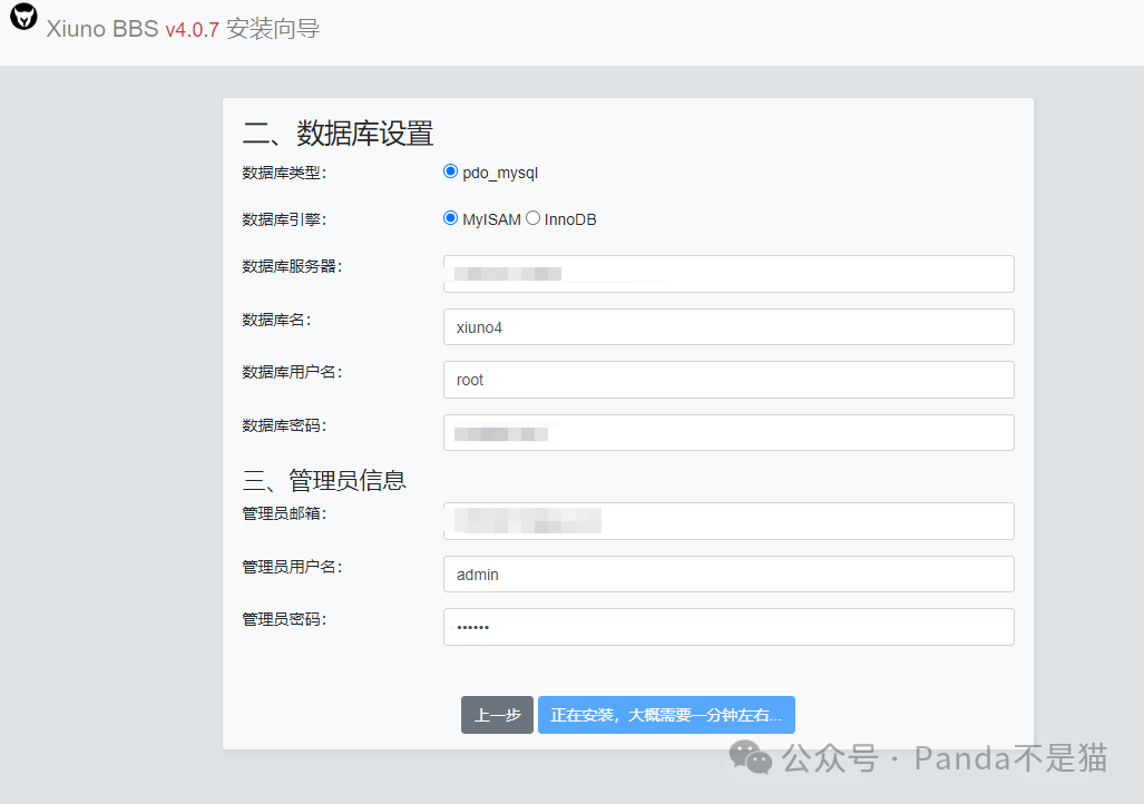 随后数据库这里支持mysql以及DB,不需要去创建,我们只需要设置好数据库地址以及用户名和密码,便会自动创建数据库了,下面的管理员信息记得修改。