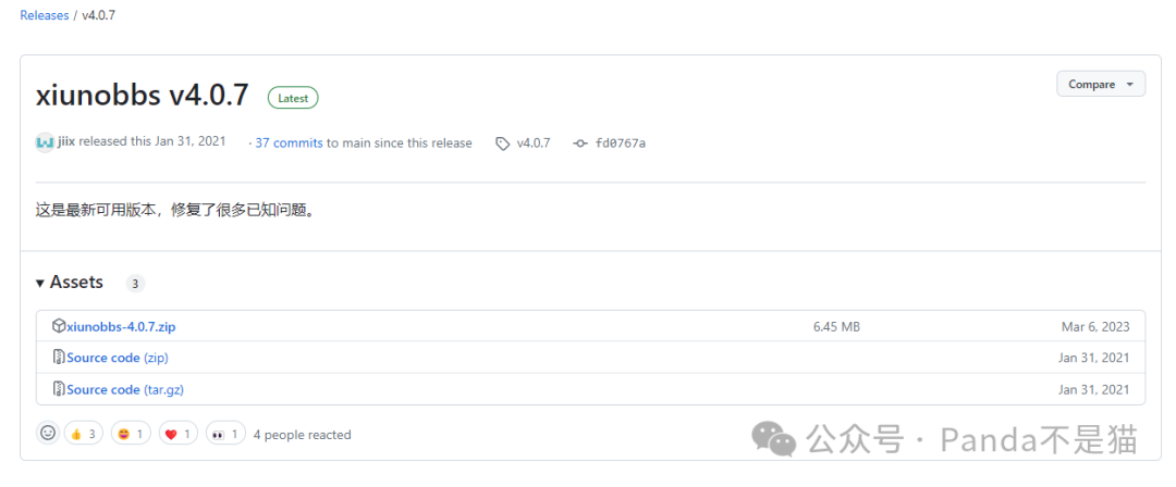 首先我们需要去项目界面下载发行版压缩文件,github搜索「jiix/xiunobbs」便能找到,最新版本4.0.7为去年创建,也是很久没更新了,不过不影响使用。