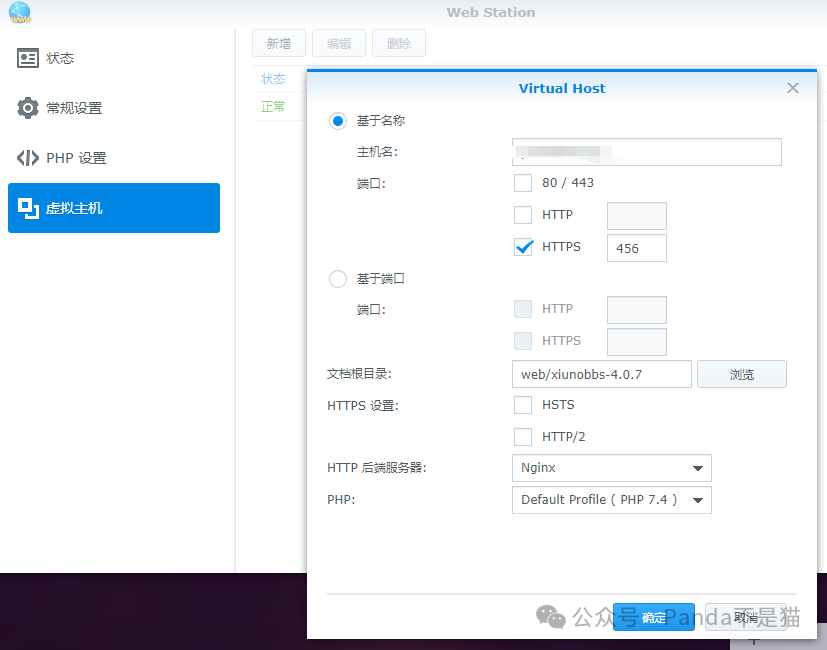 随后将下载的压缩文件解压缩到群晖的web目录中。打开web station套件,点击虚拟主机,选择新增。随后文档根目录便为项目文件夹,该项目支持Apache与Nginx,所以后端服务器随意设置都可以,php版本选择7.4即可。这里如果要使用域名记得选择基于名称,然后在主机名填写上你的域名地址。