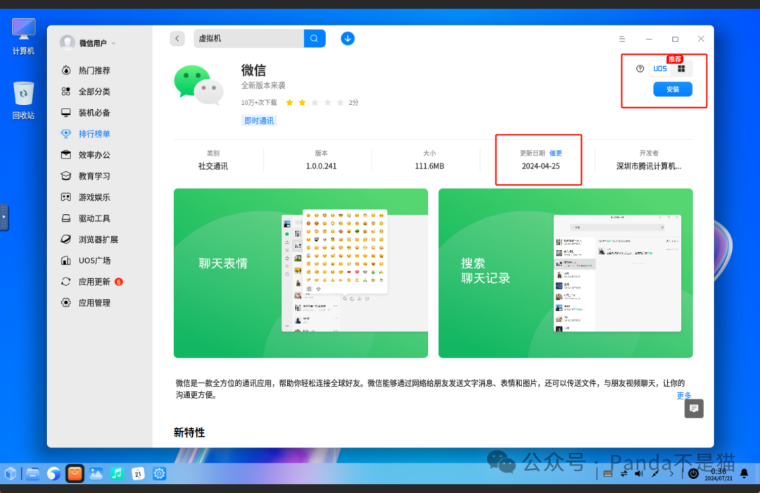 同时,刚刚的应用商店相信也有小聪明注意到了,Wine运行器这个软件也能让部分Windows应用直接运行在Linux上,比如微信便可以直接安装PC版的微信,相比UOS版本要好用很多,毕竟UOS版本上次更新时间已经是4月份的事了。