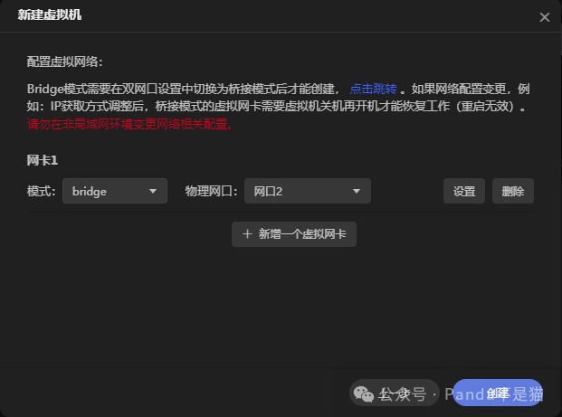 最后配置网络,这里因为我用的是网桥模式,所以需要选择brideg模式,然后选择在用的网口就行,如果你是主备模式或者没有使用聚合,那么选择NAT就行了。