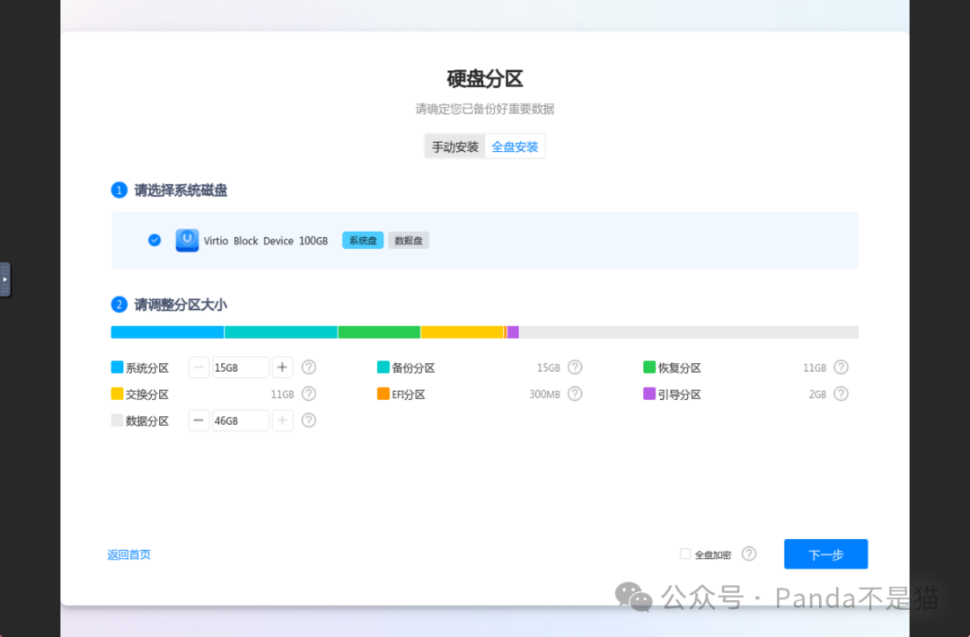 硬盘分区选择全盘安装,分区设置这里可以设置系统分区和数据分区,根据自己需要设置就可以了,下方的全盘加密就没必要了,毕竟本身是作为虚拟机运行。