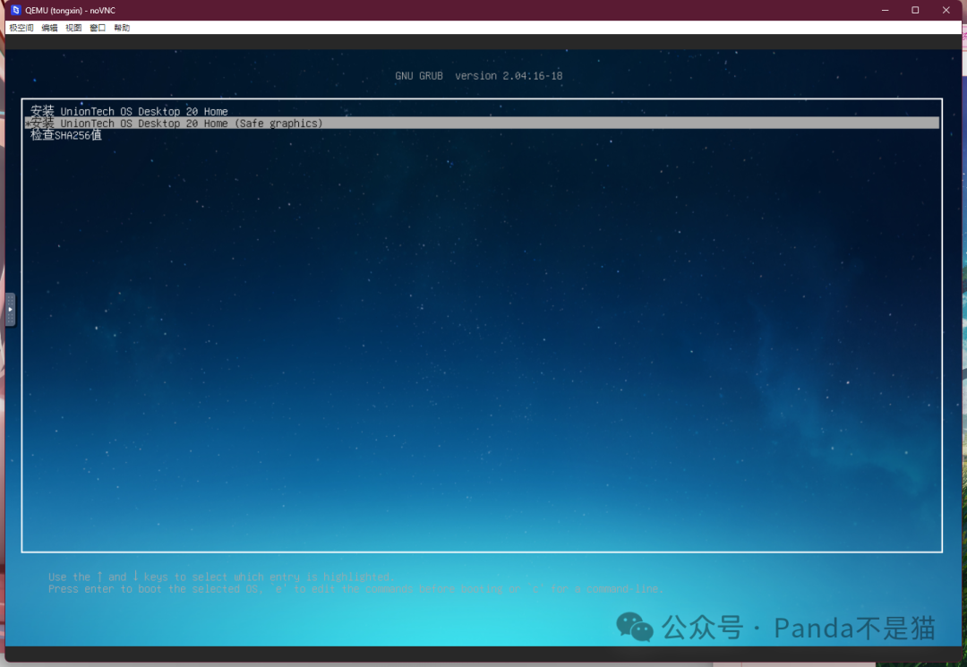 配置完成之后点击创建虚拟机,这时候极空间会自动弹出VNC远程界面,选择第一个安装统信桌面操作系统。