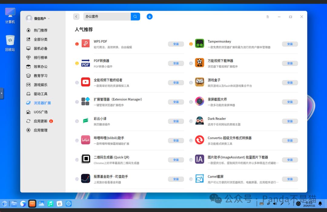 进入系统的软件中心,分类做的还算不错,甚至还提供了浏览器扩展的分区,毕竟浏览器内核用的就是Chromium,所以即便扩展分区里没有的,也可以自行网络下载安装。
