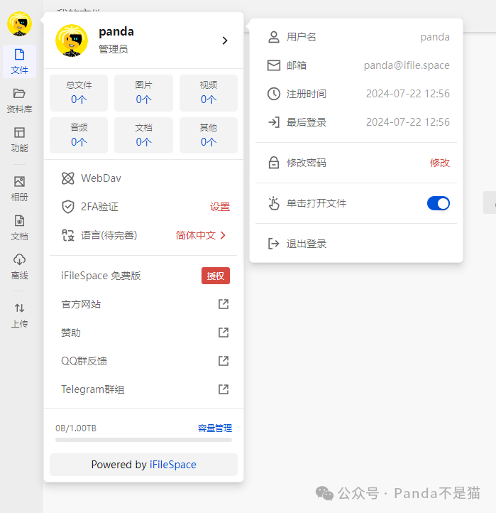 点击头像可以弹出个人信息与文件统计,总文件数量;图片、视频、音频等数量都会具体展示,再次点击头像还可以弹出更多信息,例如注册时间与邮箱等等。