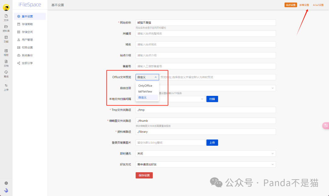 先不急着上传文件,点击左下角的设置,这里可以调整网站的基本设置,例如名称、关键词、域名等等,同时该项目支持设置OnlyOffice、kkFileView以及微软作为文档预览。右上角还可以调整邮箱以及ar2设置。设置中还能选择是否打开即时通讯的功能,这一点蛮有意思的。