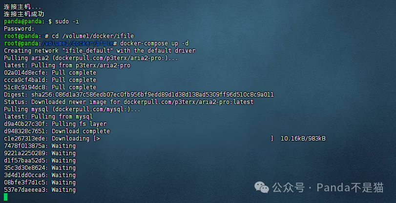 准备好一切之后我们打开NAS的SSH端口,连接上NAS之后通过sudo -i获取管理员命令,再通过cd命令移动到我们项目的根目录下,执行命令:docker-compose up -d拉取并启动容器。