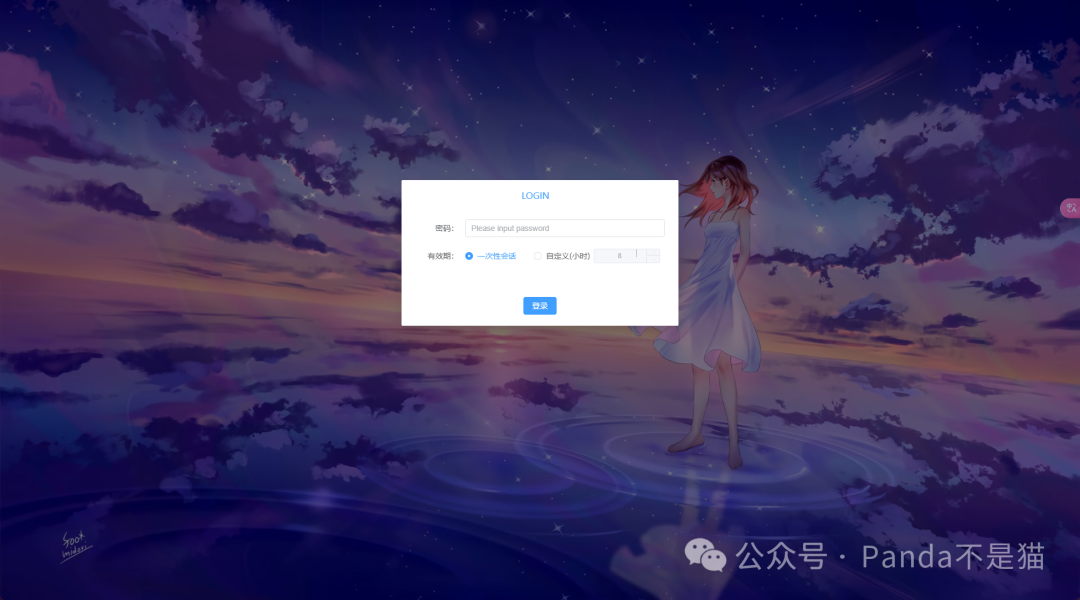项目登录有账号密码,同时这里也有有效期的选项,如果选择一次性会话,那么关闭之后就需要重新登录,自定义则可以选择保留时长,默认密码为admin。
