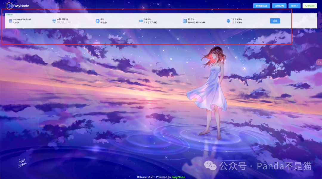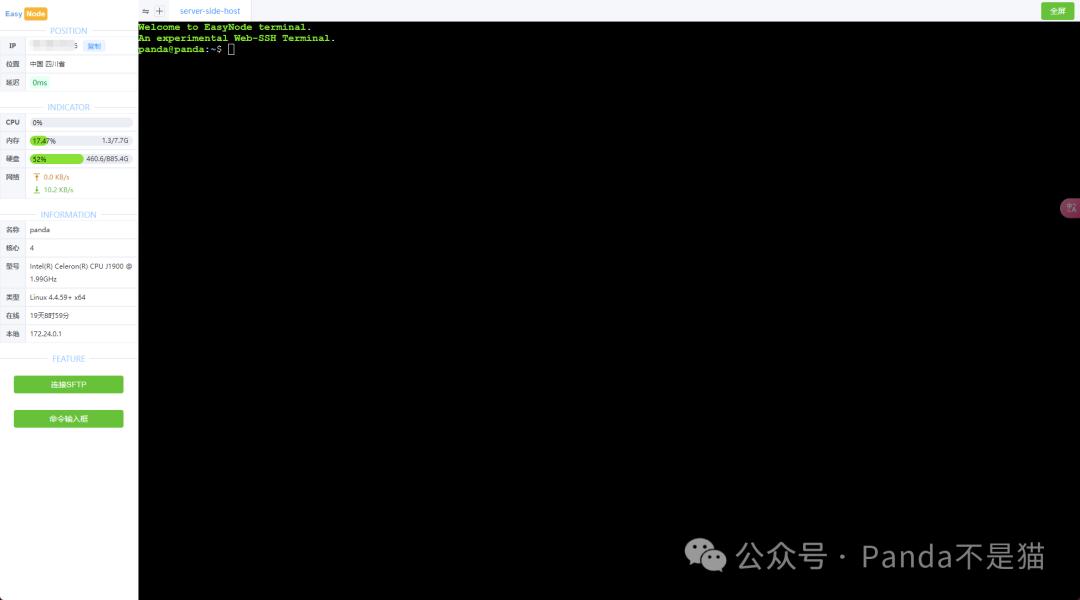 登录之后就能看到当前的登录服务器信息了,常规的ip、cpu、内存以及存储和网络信息。