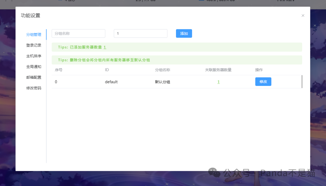 点开右上角功能设置还能查看登录记录、进行分组管理、全局通知以及邮箱设置等等。记得部署之后在这里来进行密码修改。