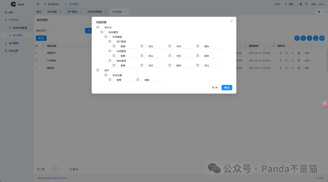 在权限管理中,可针对新建用户进行权限设置,同时也可以选择将用户添加到对应的角色组,角色组可单独设置权限。