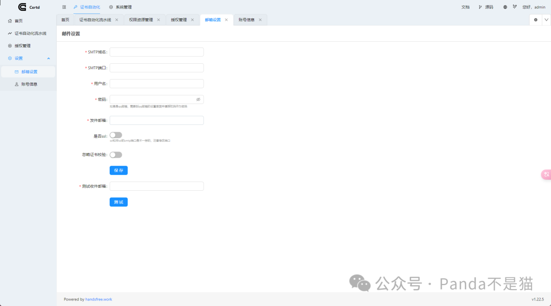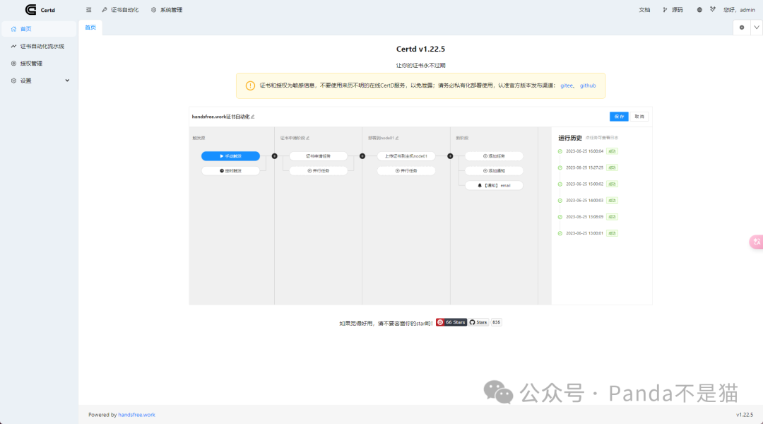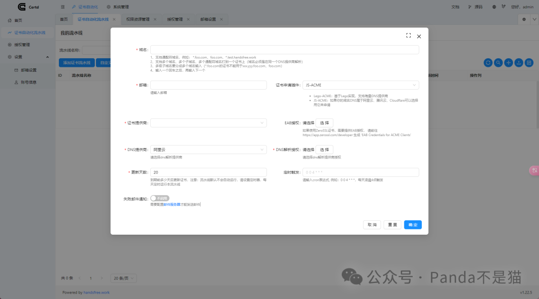 至于证书自动化,因为熊猫本身已经部署有lucky,所以就不展示自动化过程了。设置中能看到大差不差,填写域名、邮箱、设置证书提供商、DNS提供商等等,一系列设置之后就能看到流水线了。