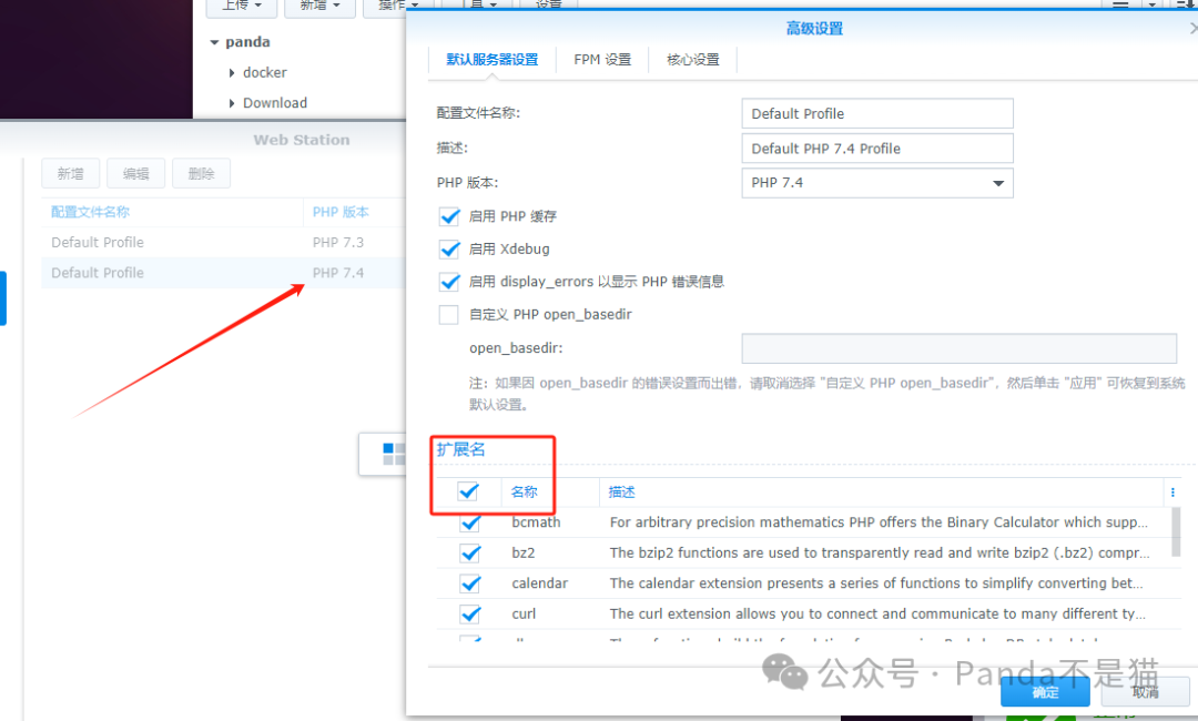 解压之后能看到使用说明以及项目的根目录,这时候我们打开web station套件,在php设置中选择php7.4版本,编辑界面中将其扩展全部勾选。