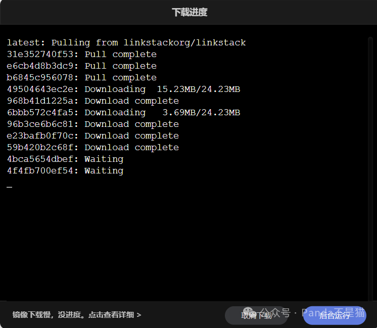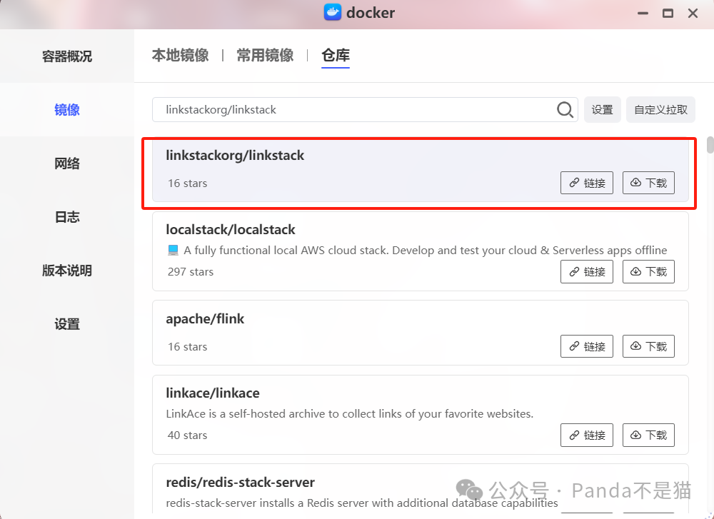 设置好docker代理或者镜像源之后我们搜索「linkstackorg/linkstack」找到如图所圈出来的镜像,下载选择latest标签就可以了。