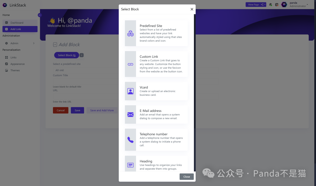 点击add new link添加新链接,点击Predefined Site可进行站点的预设,例如这里弹出的自定义站点、自定义链接、名片、电子邮箱等等。