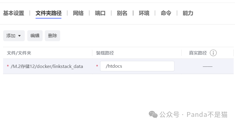 完成下载之后我们选择镜像创建容器,文件映射上你可以选择新建一个「linkstack_data」文件夹并将其映射路径设置为/htdocs来实现数据持久化操作。