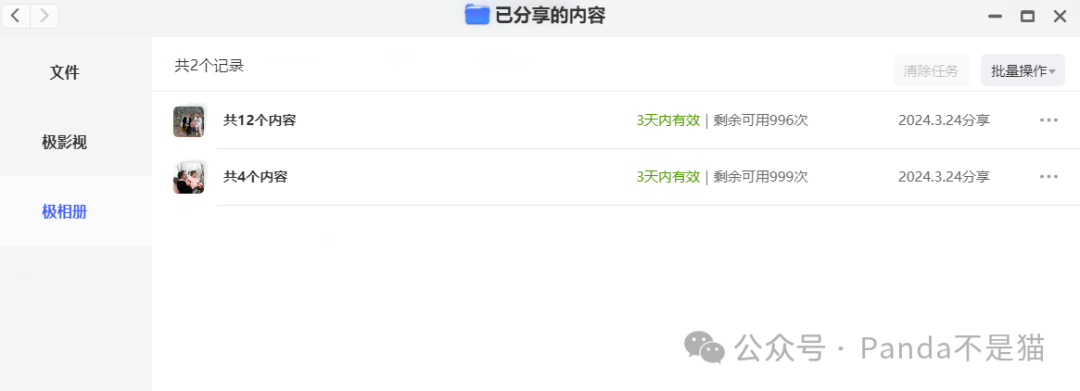 NAS的功能大家都不陌生,同时极空间的NAS特色功能大家也不比陌生。文件分享上我们有常规的链接分享以及闪电传这样的功能,同时不只是文件,我们也可以针对影视以及相册内容进行分享,在分享管理中还能查看与设置分享时间、分享密码等等。