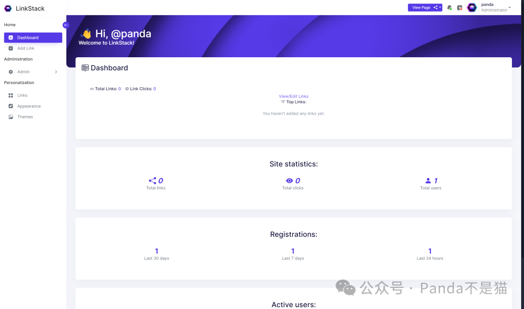 登录之后主界面便是项目的仪表盘,这里会显示当前的链接数、查看字数以及用户数,下方也会展示30天、7天以及24小时的情况。