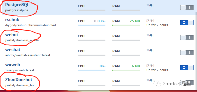 此项目需要多个容器配合使用,这里涉及到了机器人本体、GO-cqhttp、postgreSQL以及机器人的后台管理界面webui。