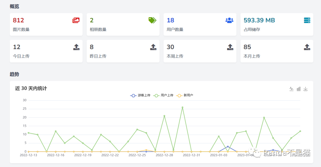 除了以上功能,兰空还提供了控制台,能够看到当前注册用户,上传数量,占用存储以及各个时段上传数量,甚至提供了曲线图供你下载。