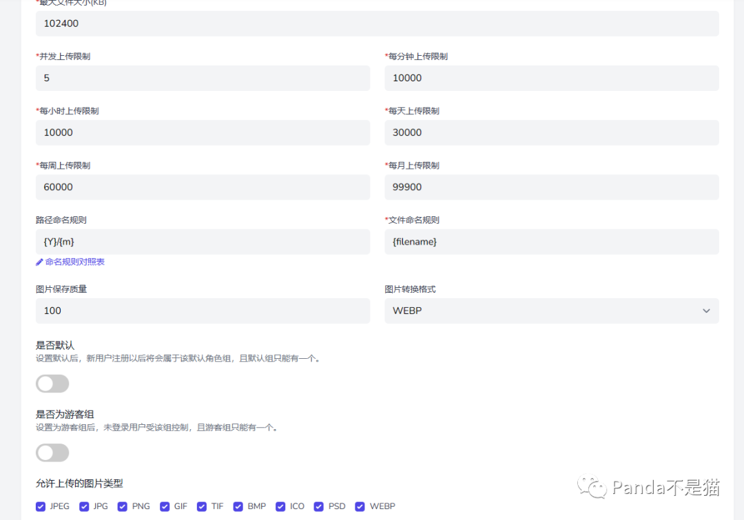 针对图片上传可设置项也是十分的多,除了能设置可上传类型,大小以及同时上传限制以外,2.0的最新版本还加入了图片格式转换,像我用于建站,我会把所有上传图片转换为webp格式,更能适用于网站,提高访问速度。