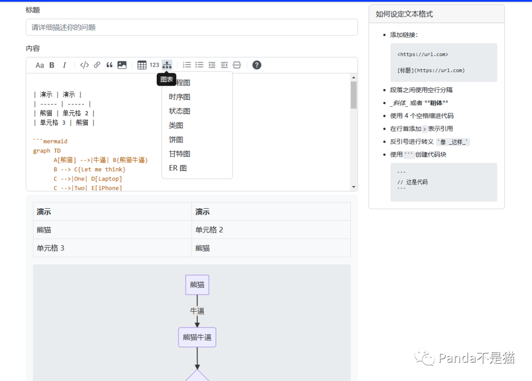 在编辑提问界面可以看到支持形式很多,支持在线预览,编辑器采用的markdown格式,支持行内公式以及公式块,图表更是基本支持所有常用图表了。