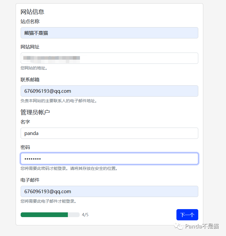 安装界面支持中文,按照步骤提示安装即可。数据库这里可选项有三种,根据自己情况而定。随后设置网站的基础信息,用户名以及密码。