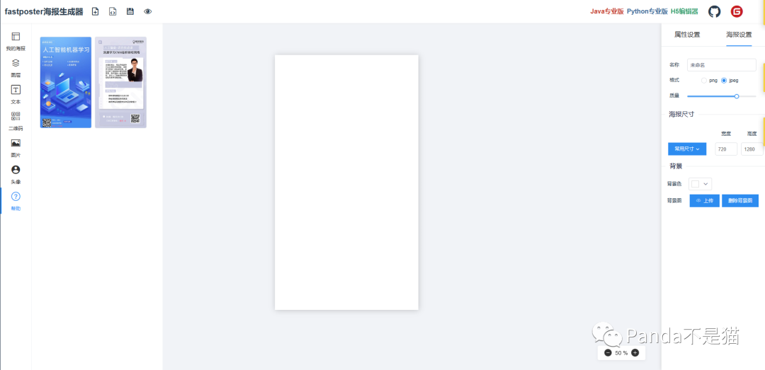 易用,支持「docker」部署,开箱即用;灵活,支持「Java」 「Python」 「Go」 「PHP」 「JS」 「小程序」等;高效,基于低代码理念设计,无需编写复杂代码。这是fastposter官方的宣传语,具体使用起来体验如何,我们部署后再看看效果。