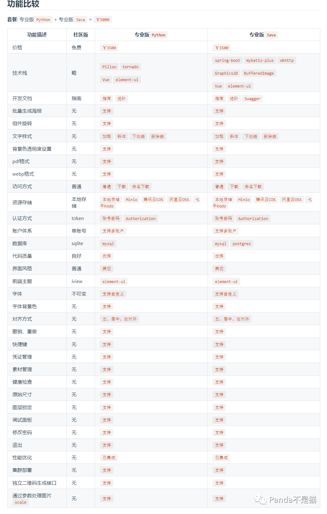 针对免费版和付费版本对比在他们官网也有的,这里我也贴出来了。