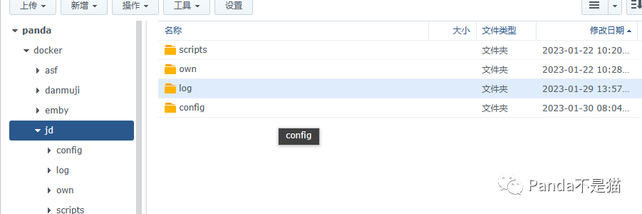 随后在docker文件夹中新建文件夹,命名自己来,jd也好容器名也行。再在新建的文件夹中建立四个子文件夹分别为:「scripts,own,log以及config」 。