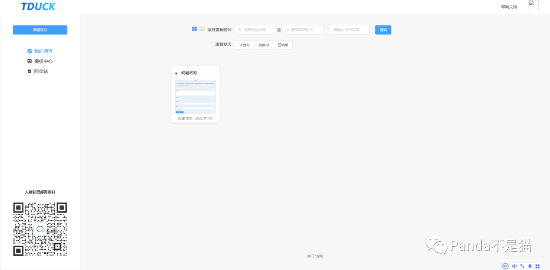 登陆后就能看到主界面了,界面很简单,就一个我的项目以及模板中心,因为容器资源的问题,模板中心这里无法加载,我们直接新建项目看看它能实现什么功能。