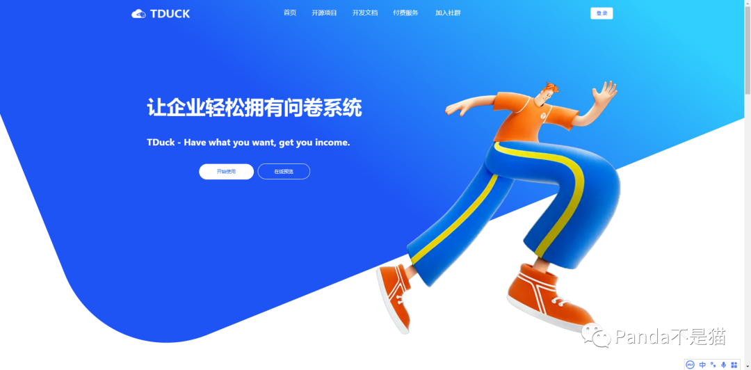 进入后首先看到的是这样的界面,这里我们直接点击右上角的登陆即可,值得注意的是,扫码这个是不能用的,应该是属于商业版的东西,这里我们直接用账号密码登陆。默认账号密码为test@tduckapp.com密码12345678。
