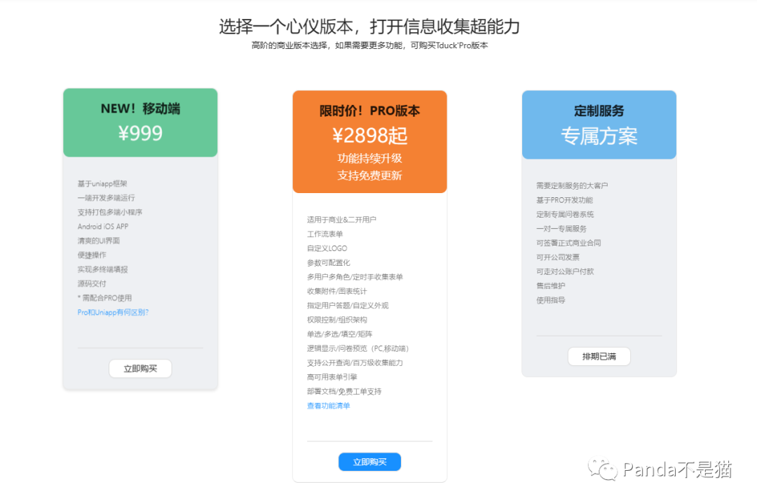 之前介绍过一款考试与调查表的项目,今天介绍的也是一款表单数据收集容器,但不同之前的是,该容器整体倾向于数据收集,同时该项目具备分发统计功能,让你的分发更加清楚没能明白每个表单有多少的点击以及多少完成度。该项目拥有开源版、移动端以及商业版本,相应的价格如下: