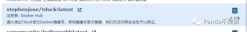 在docker中搜索 「stephenjose/tduck」 此镜像为官方镜像,不过存在缺陷,镜像中的网络资源加载有一定问题,所以没办法获取官方的资源,只能自己添加。