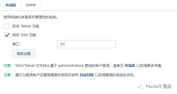 这里需要用到ssh命令部署,所以我们首先需要打开NAS的ssh功能,建议将ssh的默认22端口改一下更好,或者每次用完关闭。