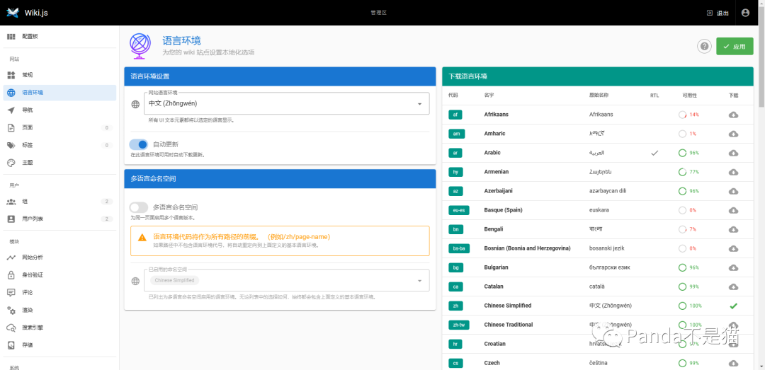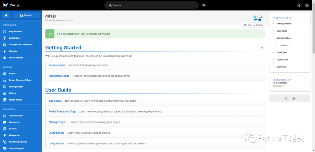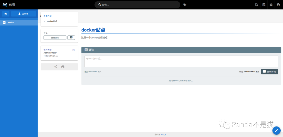 之前有人问过有没有知识库一类的项目容器,恰好最近我有想法将我整理的所有内容整合一下,搭建一个公开的知识库,这样以往的内容也方便大家查阅,有点类似于咱们知道的游戏百科一类这种形式。于是我我就将之前发现的一款容器翻出来了,那便是wiki.js。它是一款轻量级、功能强大的 wiki 开源项目,拥有评论、Markdown 编辑器、图片上传、标签、全局搜索、协同编辑、编辑历史、用户管理、谷歌分析等功能,而且支持高度自定义,重点是支持中文,而且界面简洁还不失美感,这点足以让它在众多同类项目中脱颖而出。