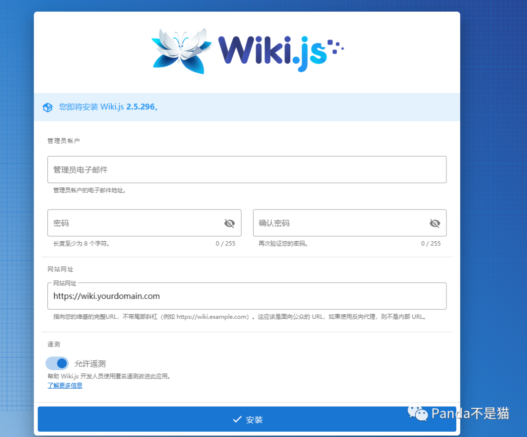 当日志中出现这样的信息,容器也就部署成功了,直接浏览器输入http:NASIP+端口即可访问安装界面。默认是英文界面,但我们可以直接用浏览器的翻译翻译成中文,这里显示让我们设置管理员邮箱以及密码和咱们的wiki首页。