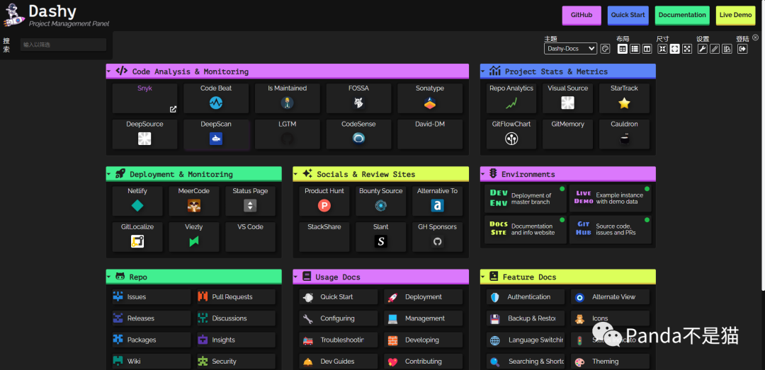 自托管个人仪表板。包括状态检查,小部件,主题,图标包,UI编辑器等等!具有多人访问权限设置,支持十多种语言翻译同时支持配置的云端同步。不过需要你有小小的设计想法,不然整出来就很难看,设计好之后还是蛮不错的。