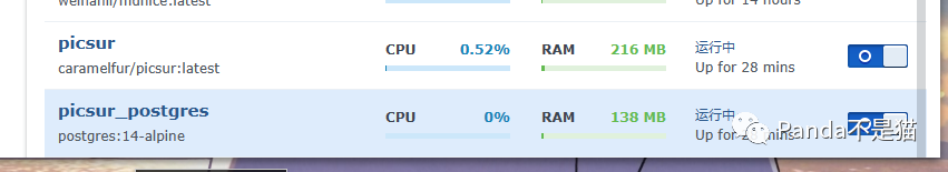将上述准备工作做好后我们打开ssh工具连接到nas,随后以此执行以下命令。先获取root账户权限——sudo -i随后进入到yml所在目录——cd /volume1/docker其次我们启动容器——docker-compose up启动后静静等待命令执行结束即可,在接受后你可以看到你的docker中会多出两个容器已启动,此时容器也就部署成功了。