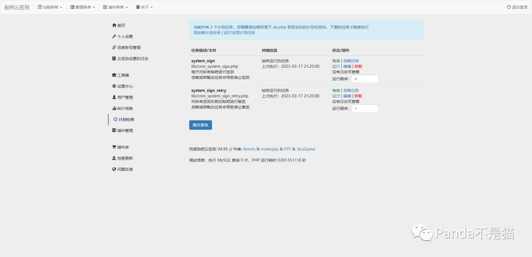 登录后就能到计划任务界面看到签到任务了,当然你需要先登录你的贴吧账号,而除了签到以外,该项目还有插件库,按照步骤安装插件后便可以实现其他功能。