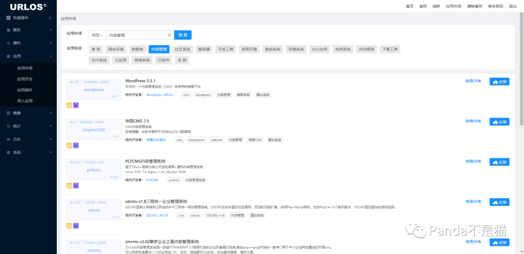 首次登录后需要你去他们官网注册账号,和宝塔一样的,界面也和宝塔差不多,这一类平台都这样。这里值得一提的是他自带的应用市场,你可以直接在应用市场进行安装,根据他的提示操作就行了,整体应用类别以及应用数还是不错。