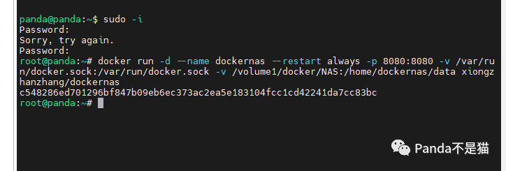 下载好之后我们不能直接启动,因为需要关联docker的安全守护,而群晖的docker不能直接映射 「docker.sock」 文件,所以我们还是需要打开ssh,随后用ssh工具登录群晖获取管理员权限。再以此执行以下命令:sudo -idocker run -d --name dockernas --restart always -p 8080:8080 -v /var/run/docker.sock:/var/run/docker.sock -v G:as:/home/dockernas/data xiongzhanzhang/dockernas8080:8080左边本地端口可随意设置,不冲突即可, 「G:as为nas系统存储数据」 的目录,需替换为自己机器实际存储数据的目录。随后浏览器访问 「http://IP:8080」 即可访问登录界面了。