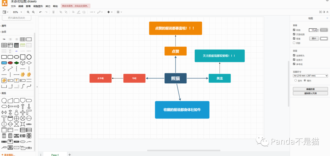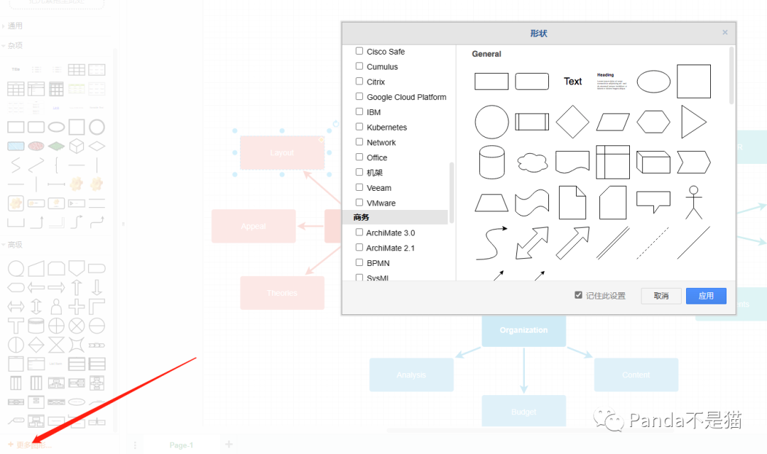 编辑绘图界面,左边为工具栏,右边为调整栏。作为思维导图也是支持点击图形上的箭头自动扩展分支的,同时左边的工具栏如果没有你想要的图形,你可以选择更多图形去添加,支持种类很多。