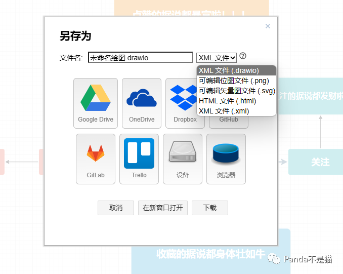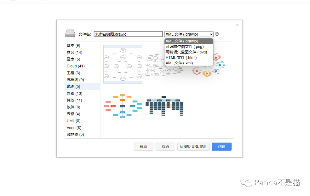 选择新建绘图,随后你能看到它提供了各种模版,并且直接通过url导入模版,保存的文件格式也是多选的,支持drawio自有格式以及html、xml以及png位图和矢量图。
