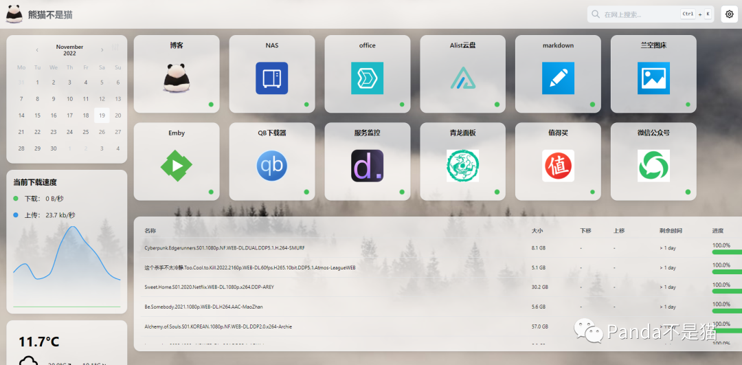 应用添加这边官方也提供了类型选择,当你选择类型和模块匹配时,便会自动帮你建立主页的模块组,例如我这里的QB下载器,便自动识别了下载器中的种子情况。这里贴一个我自己的主页。